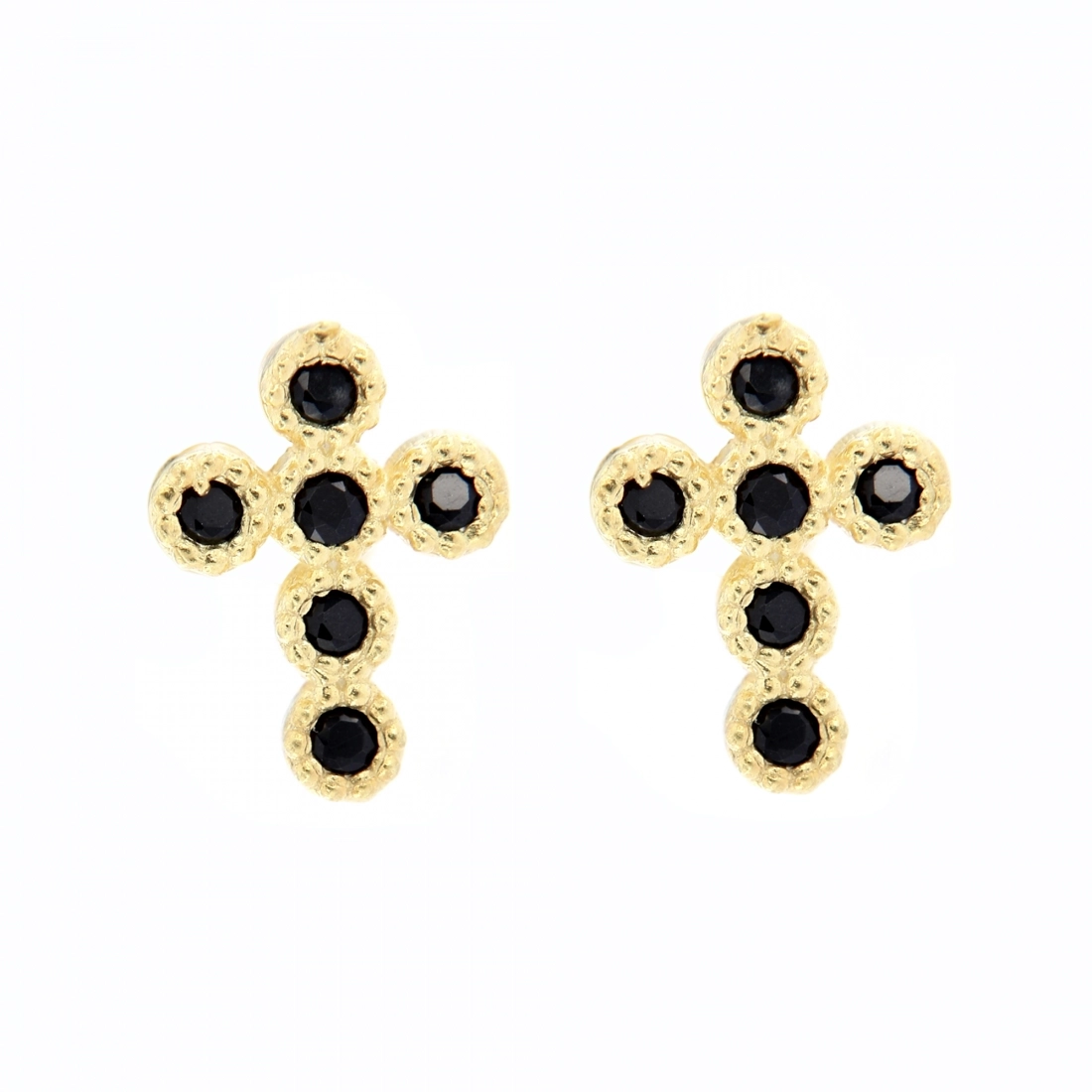 Deliziosa coppia di orecchini, in argento 925 rodiato, e crocetta di dimensioni 0,8x0,6 cm, impreziosita da zirconi. Disponibili in due varianti di colore, la versione BIANCO con zirconi bianchi e argento 925 rodiato e la versione NERO con zirconi neri e argento 925 finitura dorata.