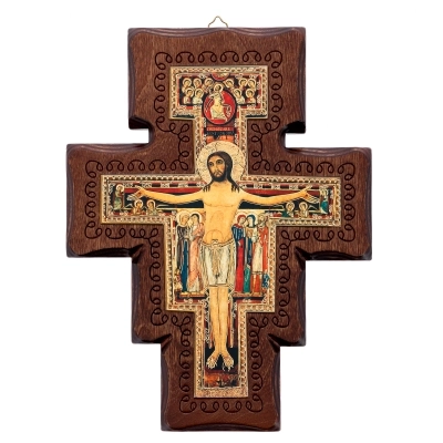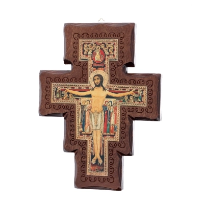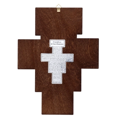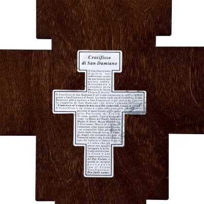 Carinissimo crocifisso di san Damiano,da appendere, con stampa centrale e delicatissime lavorazioni e incisioni sul legno.