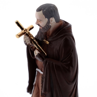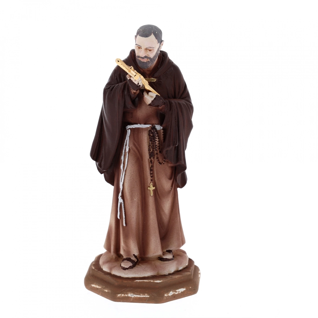 Bellissima statua di San Pio dall'altezza di 11 cm, realizzata in resina colorata. La statua di San Pio raffigura San Pio da Pietrelcina, noto anche come Padre Pio, un santo molto venerato nella tradizione cattolica. San Pio è conosciuto per i suoi stigmi, le piaghe simili a quelle di Cristo che portava sul suo corpo, e per i suoi doni di guarigione e profezia. Le statue di San Pio sono spesso presenti in chiese, santuari e luoghi di preghiera dedicati al santo, e vengono utilizzate dai fedeli come oggetto di devozione e preghiera.