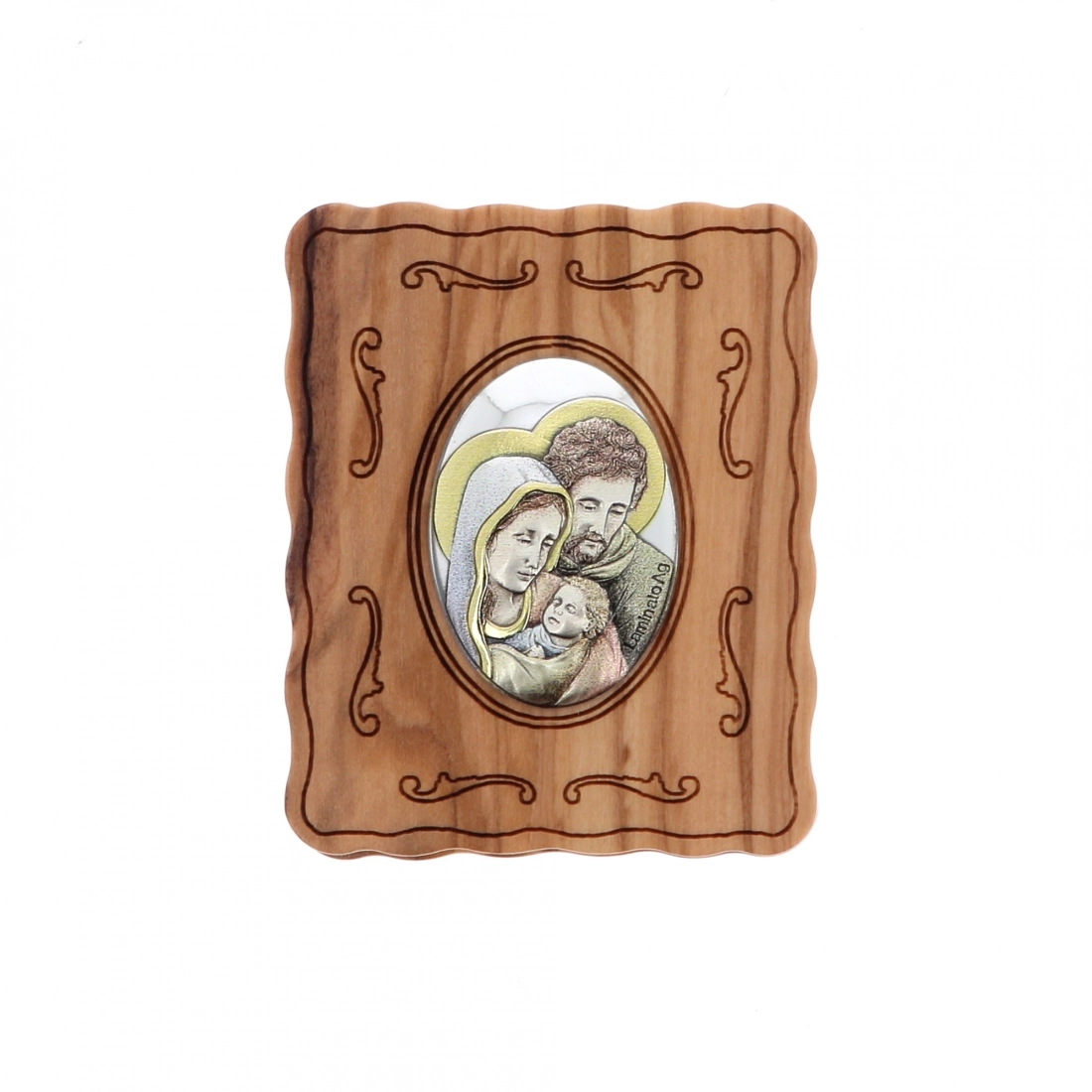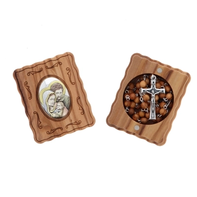 Bellissimo cofanetto interamente realizzato in legno d'olivo, di ottima qualità, con placca in argento laminato raffigurante la Sacra Famiglia. Il cofanetto contiene una carinissima corona, con crociera raffigurante la Sacra Famiglia e grano da 5 mm, anche questa in legno d'olivo. La chiusura del cofanetto è tramite calamite.