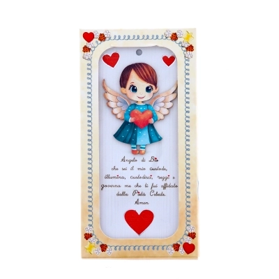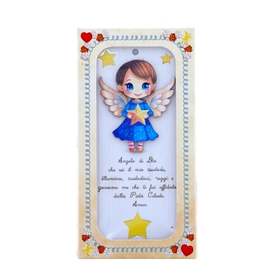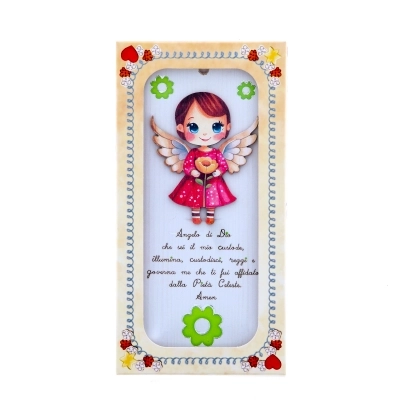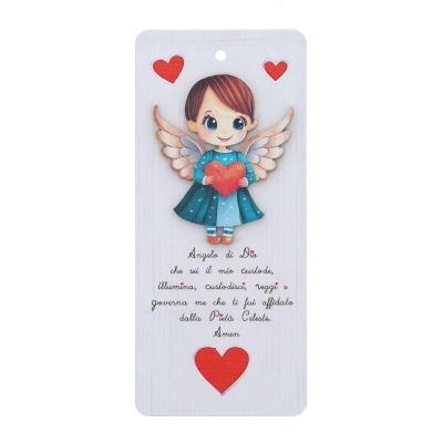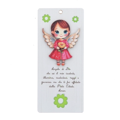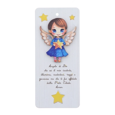 Quadretto in legno da appendere con Angelo in legno in rilievo e preghiera Angelo di Dio. Disponibile in tre varianti: Angelo con Cuore, Angelo con Fiore e Angelo con Stella. Bellissima idea regalo per una Nascita o un Battesimo da apporre in cameretta, come simbolo a protezione del bambino da parte del suo Angelo Custode.