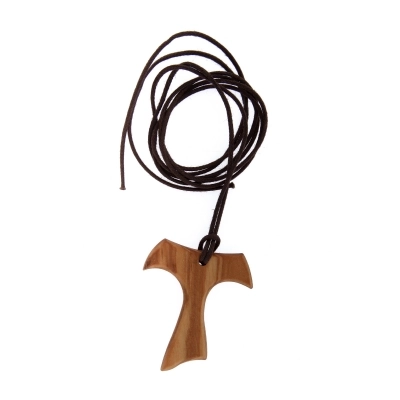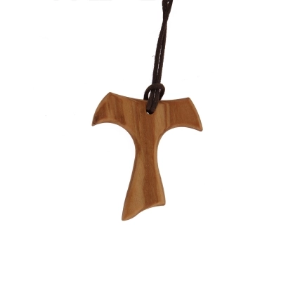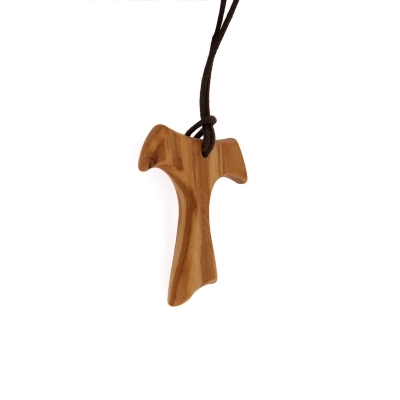 Tau in legno d'olivo, particolare per i suoi lati arrotondati, realizzato in Italia da un'azienda di artigiani. E' completo di cordoncino dalla lunghezza di 45 cm, che viene fissato al Tau grazie ad un forellino, per evitare di perderlo. La dimensione del Tau è di altezza 4 cm e la larghezza è di 3,5 cm.