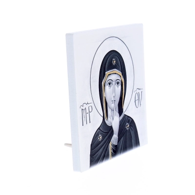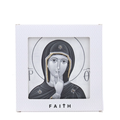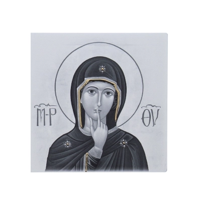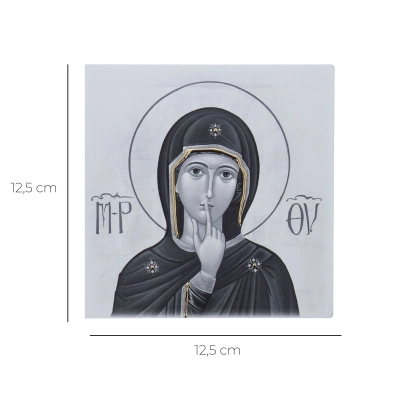 Quadretto raffigurante Madonna del silenzio, l'immagine, in bianco e nero, è impreziosita da dettagli dorati decorati a mano e in rilievo, che rendono tutto il quadretto fine e raffinato. A renderlo adatto a qualsiasi ambiente e a qualsiasi stile di arredamento della casa, è la scelta sia dell'immagine, che della colorazione in bianco e nero, molto particolare e poco vista. Il quadretto viene fornito con scatolina e piedistallo in metallo per poterlo appoggiare, ma si può anche appendere grazie al forellino presente sul retro. Totalmente realizzato in Italia con sapiente manualità artigiana.