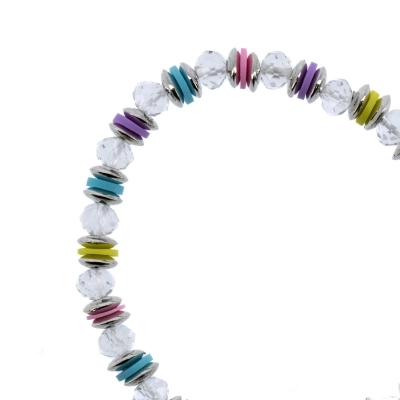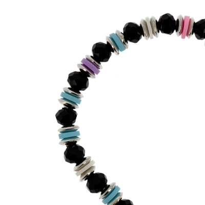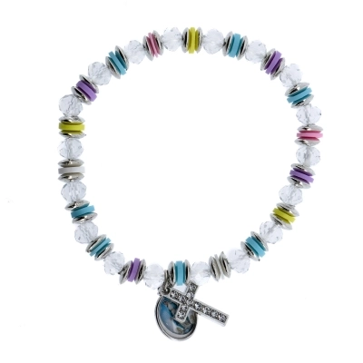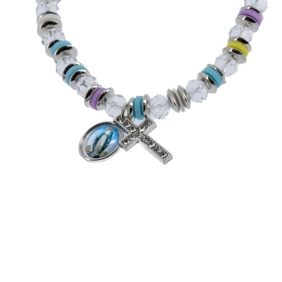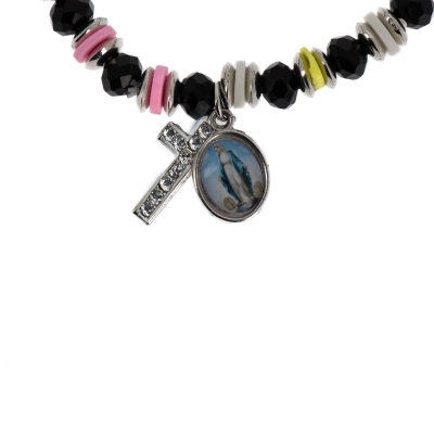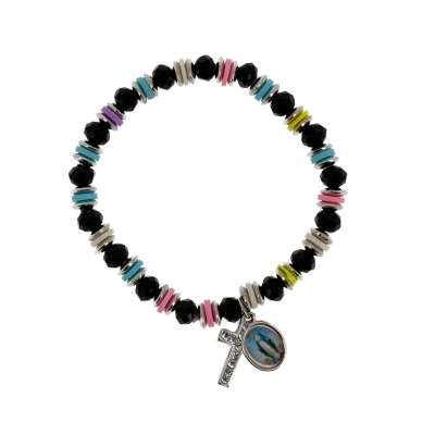 Bracciale con pietrine in simil-cristallo nero e trasparente di diametro 6 mm, separati da anellini colorati e metallo color argento di diametro 6 mm. Il bracciale ha una crocetta in metallo con degli strass, che lo rendono molto fine ed elegante. A renderlo un articolo religioso e devozionale è stata inserita una medaglina in metallo con la raffigurazione della Madonna Immacolata. Disponibile in due varianti di colore. Comodo e pratico da indossare tutti i giorni. Adatto a tutti i polsi in quanto è montato su un elastico molto resistente.
