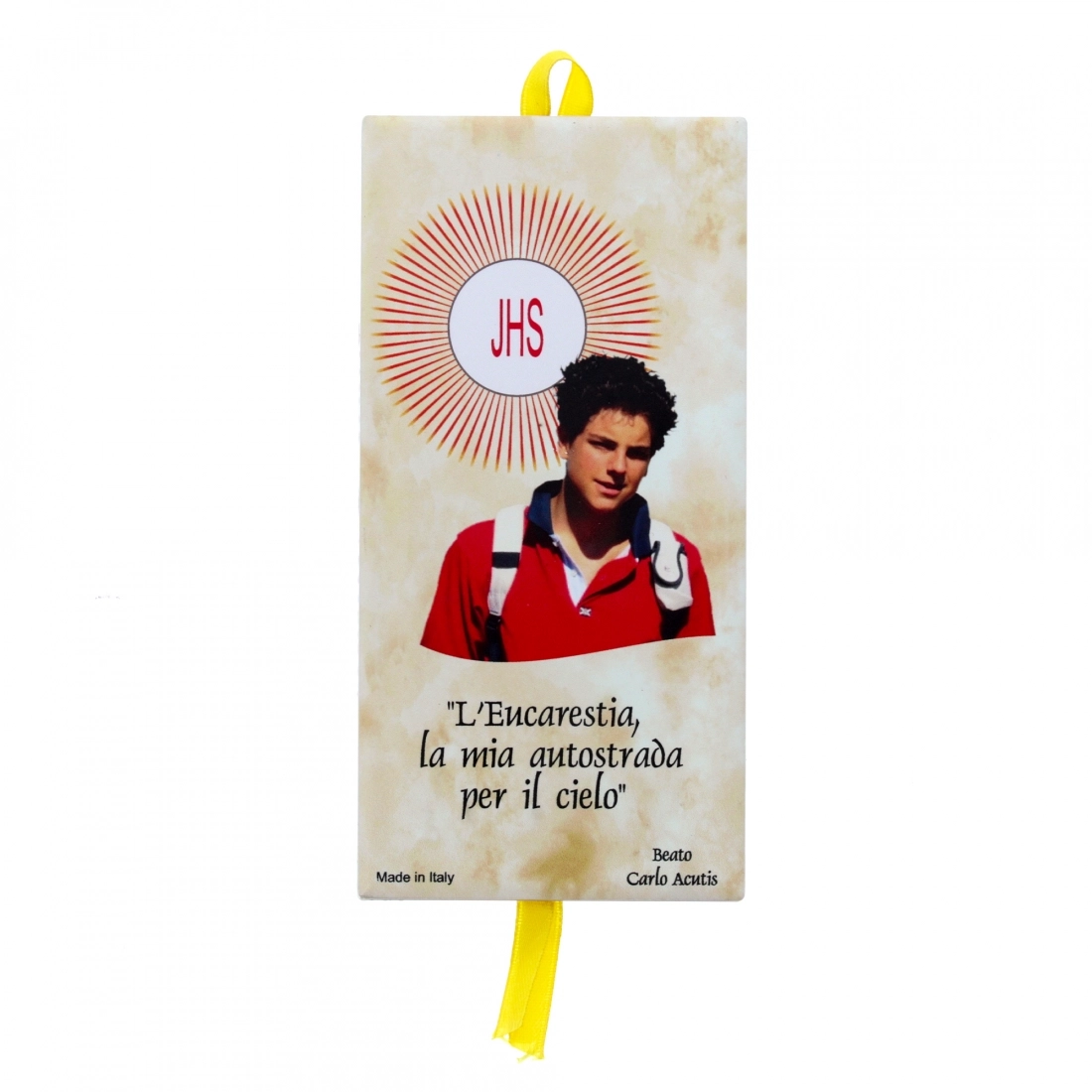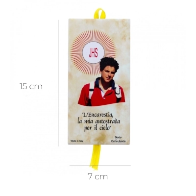 Mattonella in ceramica delle dimensioni 15x7 cm con nastrino per essere appesa. Viene raffigurato Carlo Acutis e una sua celebre frase: " L'Eucarestia, la mia autostrada per il cielo". Realizzata in Italia da un'azienda di artigiani.