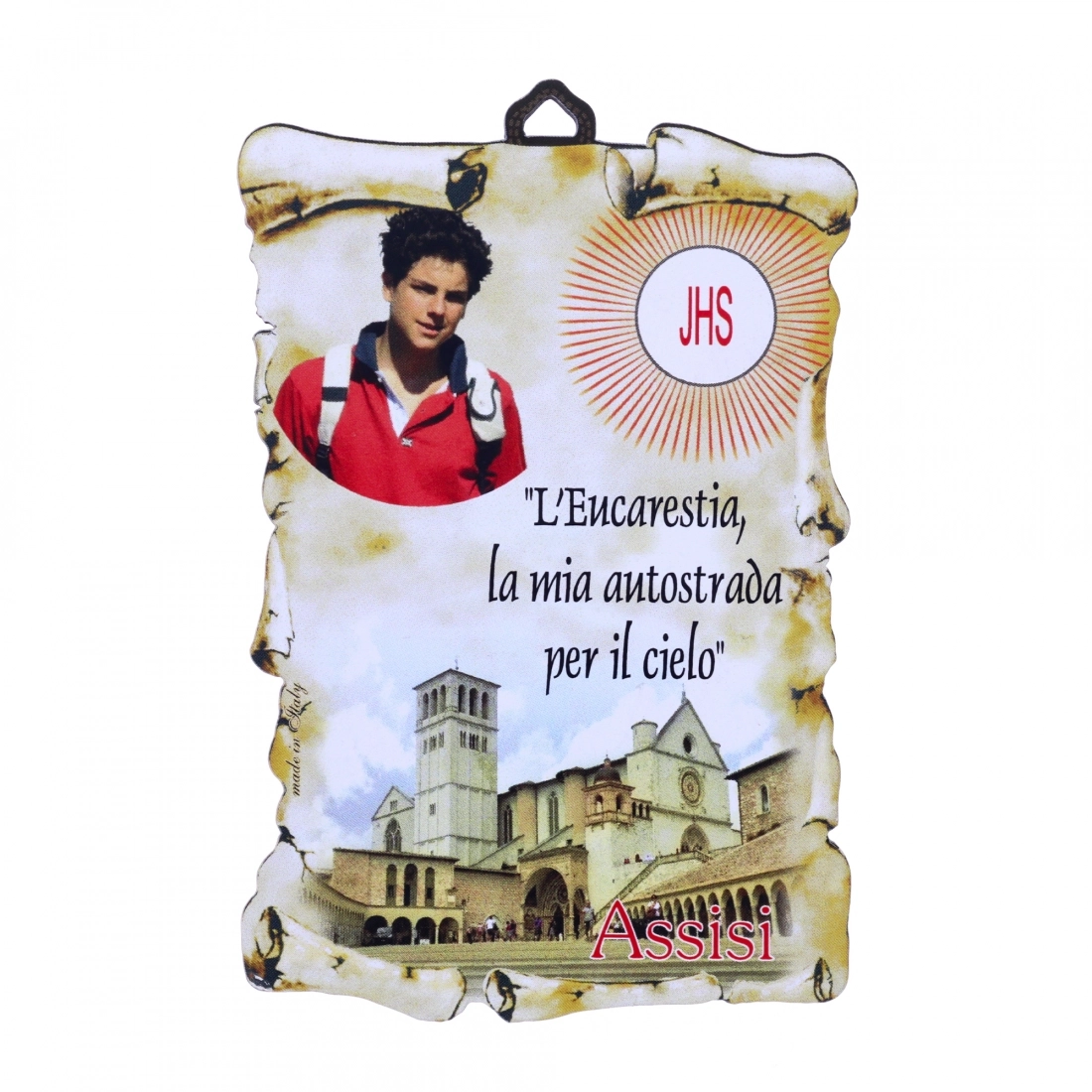 Tavoletta in legno a forma di pergamena con gancetto integrato per essere appesa e immagine di Carlo Acutis. Realizzata in Italia da un'azienda di artigiani. Dimensioni 15X10 cm.