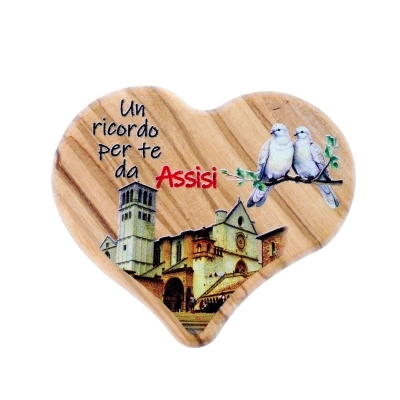 Calamita/magnete, in legno, a forma di cuore con immagine di Assisi. Dimensione 5x5,5 cm. Piccola e leggera da poter attaccare in casa senza che occupi posto. Possibilità di personalizzazione con qualsiasi grafica anche per piccoli quantitativi. Ideale per bomboniera o segna posto per qualsiasi evento.