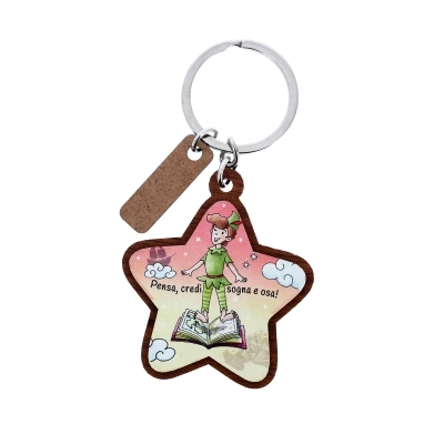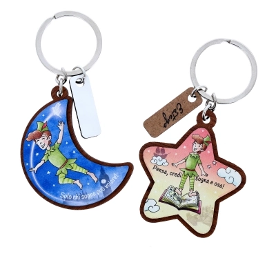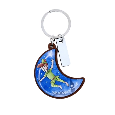 Simpatico portachiavi con immagine Peter Pan, disponibile in due varianti con sagomatura, frase e immagine differenti. Sul portachiavi a forma di stella è riportata la frase "Pensa, credi, sogna e osa!", nell'altra a forma di luna viene riportata "Solo chi sogna può volare!" Carinissima idea regalo da donare a grandi e piccini in ogni occasione speciale!