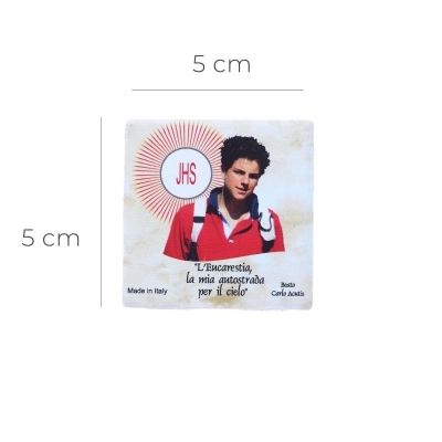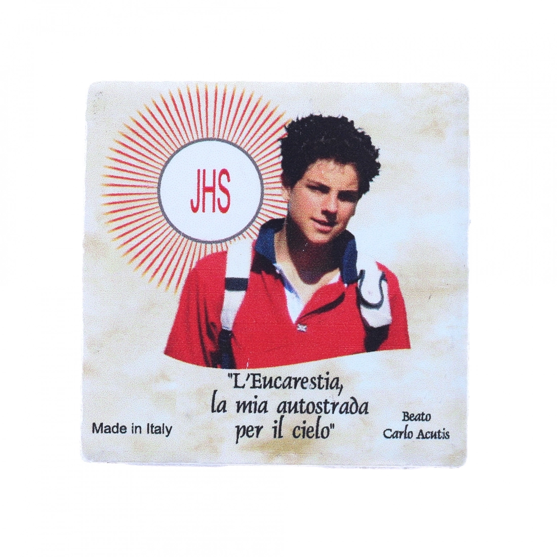 Deliziosa tavoletta in ceramica con magnete, con serigrafia dell'immagine del Beato Carlo Acutis. Dimensioni 5x5 cm