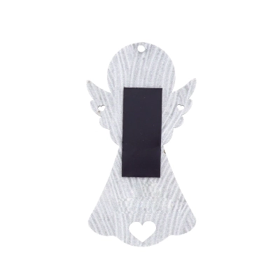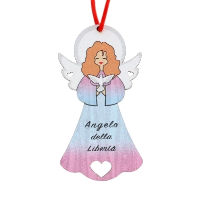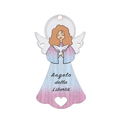 Simpatico angioletto (delle dimensioni di 9x5 cm) in legno colorato, dotato sia di cordoncino, per poter essere appeso, sia di calamita per chi preferisse attaccarlo. Riporta la frase "Angelo della Libertà", come augurio di protezione. Ottima idea regalo per una persona speciale della propria famiglia o come ricordino per sugellare eventi speciali.