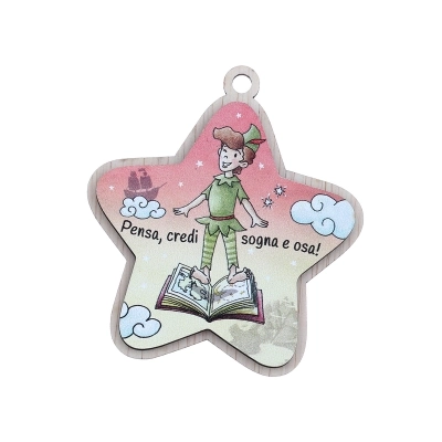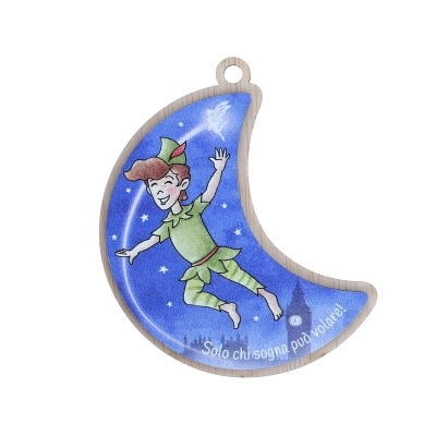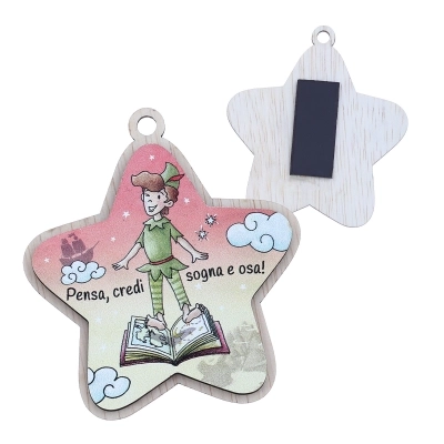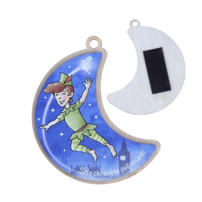 Simpatico magnete in legno colorato dotato anche di cordoncino per essere appeso, con immagini di Peter Pan. Disponibile in tre varianti con sagomatura, frase e immagine differenti. Sul magnete a forma di stella è riportata la frase "Pensa, credi, sogna e osa!", su quello a forma di luna viene riportata la frase "Solo chi sogna può volare!" e in quello a forma di libro "Seconda stella a destra". Carinissima idea regalo da donare a grandi e piccini in ogni occasione speciale!