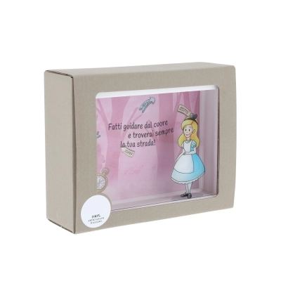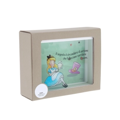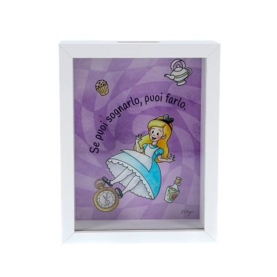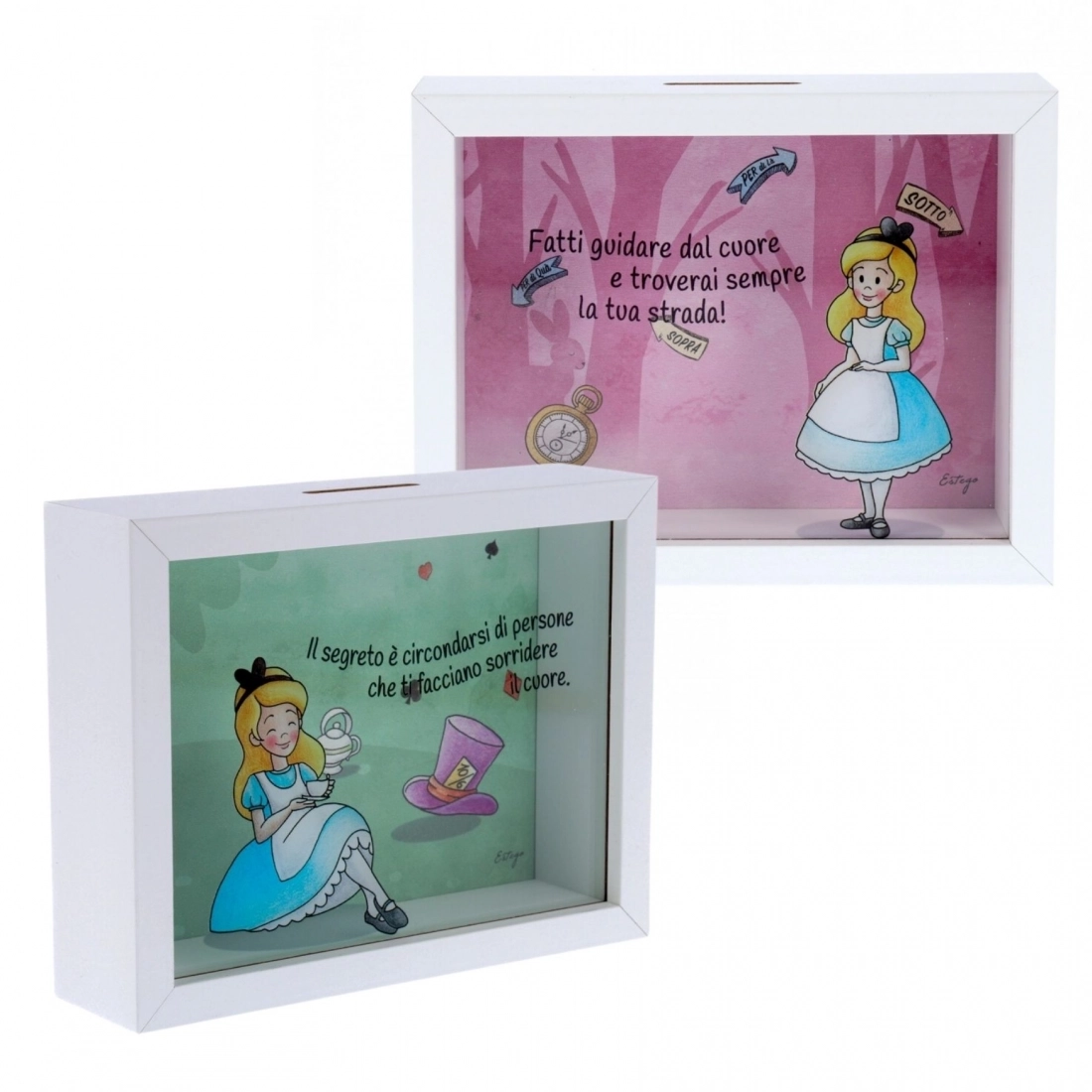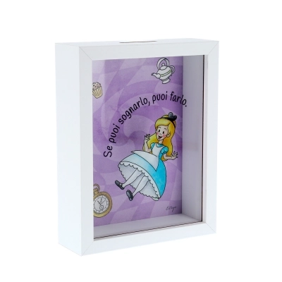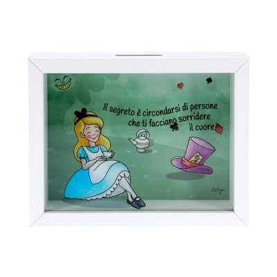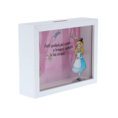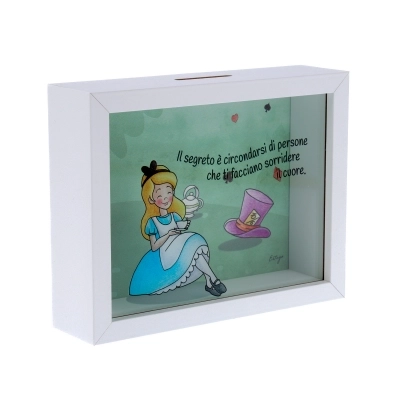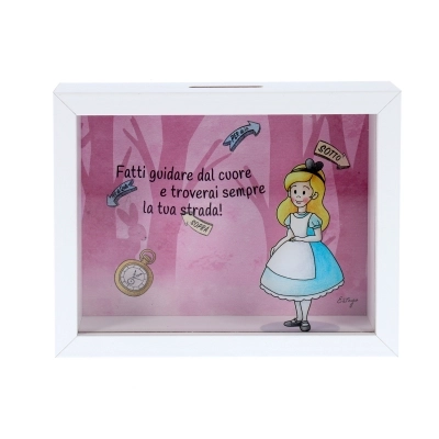 Carinissima idea regalo per i più piccoli, un simpatico salvadanaio con le immagini del celebre cartone "Alice nel paese delle meraviglie", ogni immagine è completa di una bellissima frase emozionale. Il salvadanaio è realizzato in legno bianco con la parte frontale in plexiglass trasparente, in cui è stampata l'immagine con la rispettiva frase. L'originalità del prodotto è proprio la parte frontale trasparente, che lascia intravedere il contenuto del salvadanaio. Realizzato con materiale di ottima qualità e interamente in Italia, da azienda con sapiente manualità artigiana.