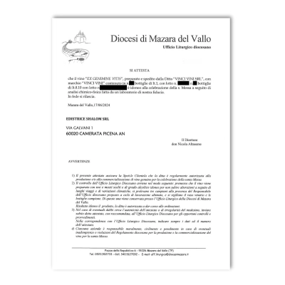 Vino per la Santa Messa bianco liquoroso dolce in bottiglia da 1 litro. Prodotto da un'importante azienda vinicola siciliana, in vitigni autoctoni, selezionando esclusivamente uve sane e genuine, che garantiscono la nascita di un vino di alta qualità, buono e autentico. Il vino per la Santa Messa dorato dolce "ex genimine vitis" (dal frutto della vite) nasce nel rispetto delle rigide regole previste dal Diritto Canonico. La genuinità e l'idoneità all'uso sacramentale sono costantemente controllate e certificate dall'ufficio Liturgico della Diocesi di Mazara del Vallo che ha la competenza territoriale per le necessarie verifiche.